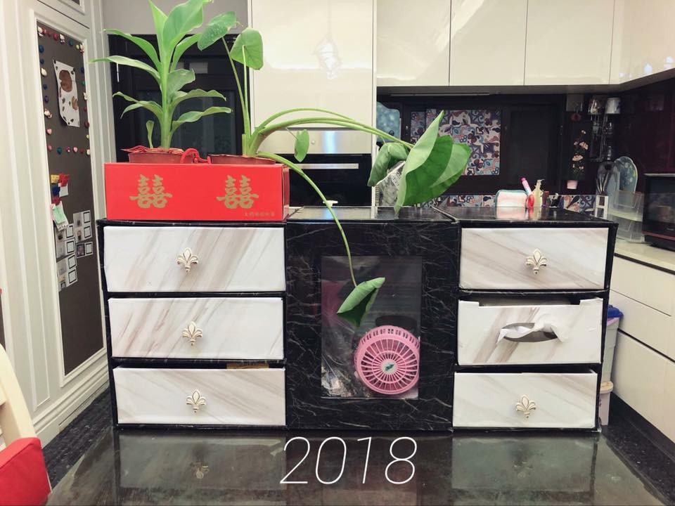 ▲網友的老婆將廢紙箱變成超有質感的大理石置物櫃。(圖/翻攝自爆廢公社)