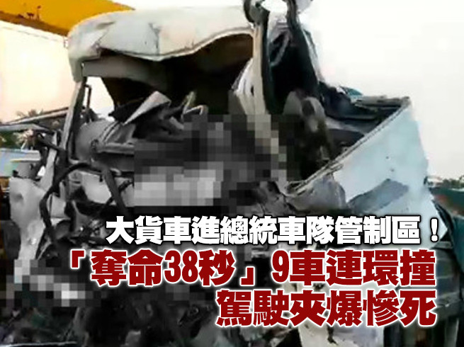 國道三號南下屏東竹田段414.7公里處5日下午發生9台車連環撞,其中一名載鹽貨車駕駛頭身一半掛在車外,當場被夾斃死亡,且貨車車頭整個凹扁。對此國道警察在稍早證實因蔡英文總統車隊經過,該路段確實因此實施交管,但肇事原因為最後一輛車追撞釀禍。