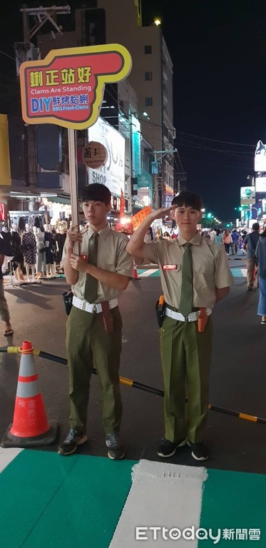 ▲▼穿著英挺儀隊制服工讀生於熱鬧夜市中舉牌格外引人注目。(圖/記者翁聖勳攝)