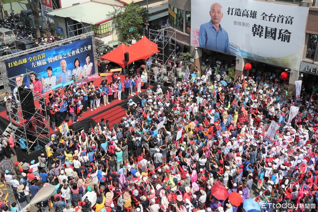 國民黨高雄市長參選人韓國瑜左楠之友後援會,6日上午在高雄市左營區曾子路成立造勢活動,現場有近8千名支持者到場,今日上午高雄天氣炎熱,支持者不怕烈日,熱情參予,現場不時揮舞國旗場面,氣氛熱烈。