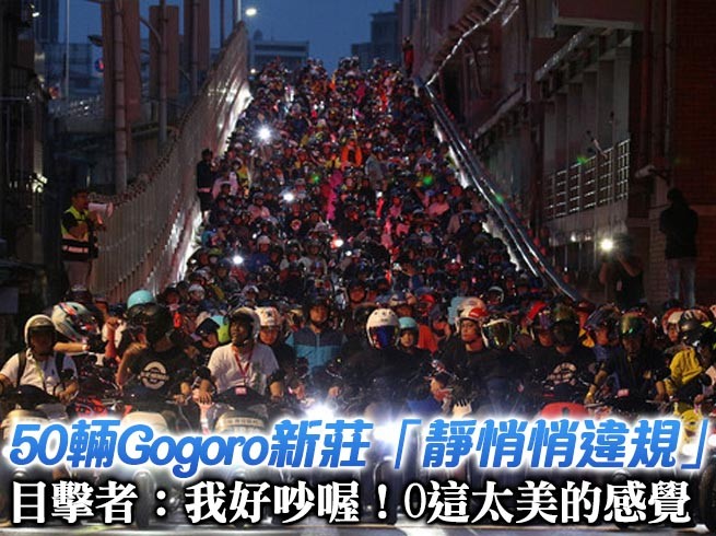 「黑色豪門企業」臉書社團貼出影片寫道,事發時間凌晨3時20分,50多輛Gogoro車隊在新莊中正路的路口違規。影片中,一輛雙載機車見到Gogoro車隊,騎士和後座乘客興奮地說,「Gogoro車隊,超亮、超屌的…我發現一件事情,我好吵喔!」
