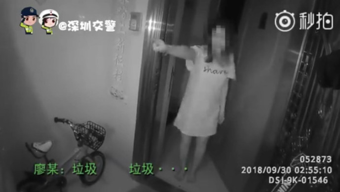 ▲廖女前來應門,說自己整晚都沒出門,是被垃圾男人誣陷的。(圖/翻攝自微博/深圳交警)