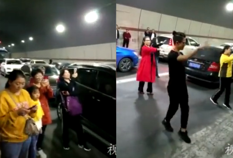 今年大陸十一長假出遊人次達到5億,網路上充斥各種堵車、塞車的情況,為了打發時間,四川瀘定二郎山隧道內有群大媽,自備音響跳起廣場舞,領舞的還是位「小哥」,讓不少人下車圍觀。