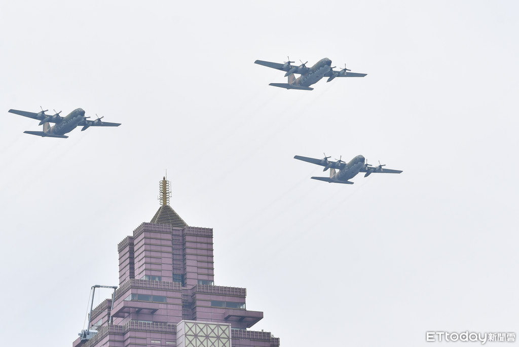 國慶大典重頭戲還有空軍出動快、慢速機衝場,包括C-130H、幻象2000戰機飛越總統府上空。這次為了雙十國慶慶典,空軍不同於去年去年雷虎小組衝場,今年出動快、慢速機首次衝場預演,包括福克50、畢琪1900、P-3C、C-130H、幻象2000戰機將飛越總統府上空。