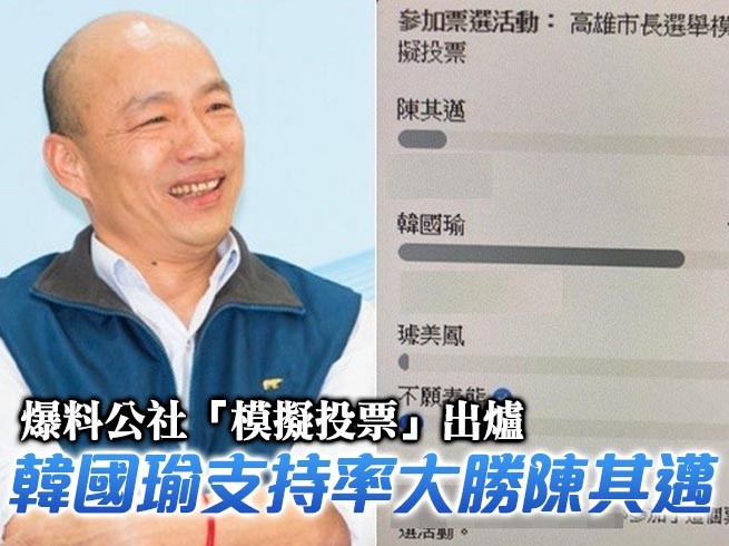 年底9合1大選剩下1個多月,國民黨高雄市長參選人韓國瑜從原本不被看好,到最近民調顯示已快追平民進黨參選人陳其邁,選情進入白熱化階段。臉書社團「爆料公社」7日晚間在網路上舉行模擬投票活動結果出爐,韓國瑜竟以77%得票率大勝陳其邁13%。