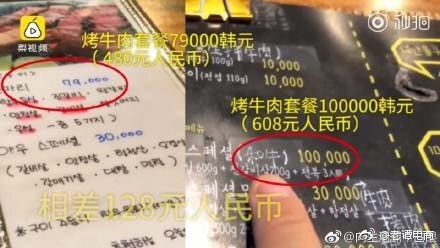根據梨視頻報導,一名大陸網友趁著十一長假期間,到韓國濟州島旅遊,在某間燒烤店裡分別拿了一份中文菜單及韓文菜單,沒想到價格不一致,像是烤牛肉套餐在韓文菜單上的價格是人民幣480元(約新台幣2153元),中文菜單上的價格則是人民幣608元(約新台幣2727元),相差人民幣128元(約新台幣574元);一份烤肉則是相差人民幣18元(約新台幣80元),辣炒年糕的價格更是相差5倍。