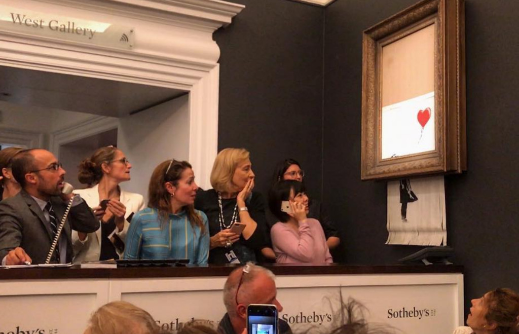 這幅畫作在英國倫敦蘇富比拍賣會以100萬英鎊(約新台幣4000萬元)成交,刷新班克斯單一作品的最高價紀錄。但沒想到,就在落槌後,作品卻突然下滑,作品下半部隨後就被暗藏畫框內的碎紙機銷毀。面對眼前情況,負責拍賣的蘇富比指出,公司對此並不知情,也沒有參與,「我們正試圖搞懂這在拍賣現場意味著什麼。」