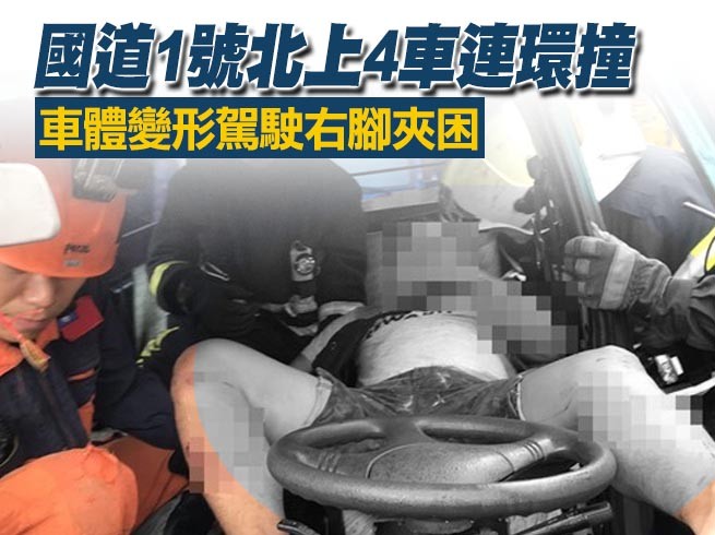 國道1號北上24.9K外側車道,8日上午1時許發生追撞車禍,現場共有4台車輛連環追撞,其中第3輛男性駕駛(約30歲)受困車內,因車體變形右腳卡住無法動彈,警消獲報趕抵以破壞機具協助脫困,駕駛肢體多處擦傷,所幸其意識清醒,送往北市新光醫院急救。