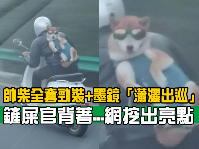 特別的是,這隻柴犬造型極為拉風帥氣,一身勁裝架式十足,臉上掛著一副太陽眼鏡,斜躺在主人背上;儘管外頭強風吹拂,它依然瀟灑出巡,看到有人拍照,嘴邊還抹過一絲笑意。
