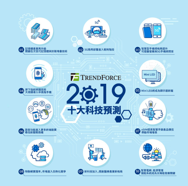 根據集邦科技,針對2019年的十大科技趨勢整理,包括次世代記憶體崛起、5G商用部署進入衝刺階段、可摺疊螢幕及eSIM智慧型手機可望面市、屏下指紋辨識成為市場新寵等。