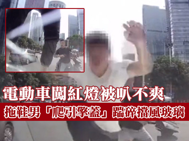 福建泉州8日上午,某十字路口突然竄出一台電動車闖紅燈,汽車駕駛許先生「叭」了一聲,並出聲提醒「你闖紅燈」,沒想到白衣拖鞋騎士立刻暴怒,飆出「五字經」罵人,並跳上車頭一腳「踹碎擋風玻璃」,就算有行車紀錄器也「沒在管」。