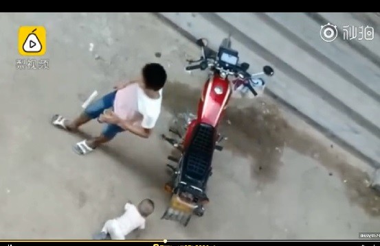 從影片上可以看到,男童爬在塵灰的水泥地上,而在旁的父親則是坐在機車上抽菸滑手機,並沒有理會在哭鬧的兒子,且就當孩子爬到自己的身旁時,還起身離去走向旁邊的階梯,絲毫沒有想抱起來的意思。