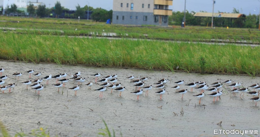 ▲整群的高蹺鴴翩然降落宜蘭縣壯圍鄉新南地區田董米田區。(圖/記者游芳男翻攝)