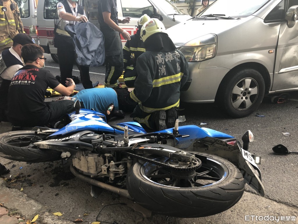 消防局接獲通報到場救援,事故發生後一名機車男性駕駛卡在汽車底部,救難人員即刻展開救援,運用長背板將傷者抬上擔架,送醫急救。