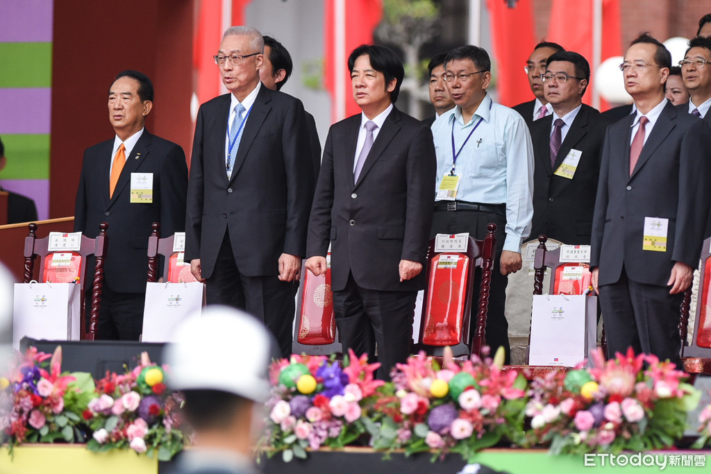 107年國慶大會登場!日前才揪國民黨立委一起唱國歌的行政院長賴清德,10日在典禮上僅微微張口,一旁的國民黨主席吳敦義則是開口高唱,而時代力量主席黃國昌嘴吧緊閉。