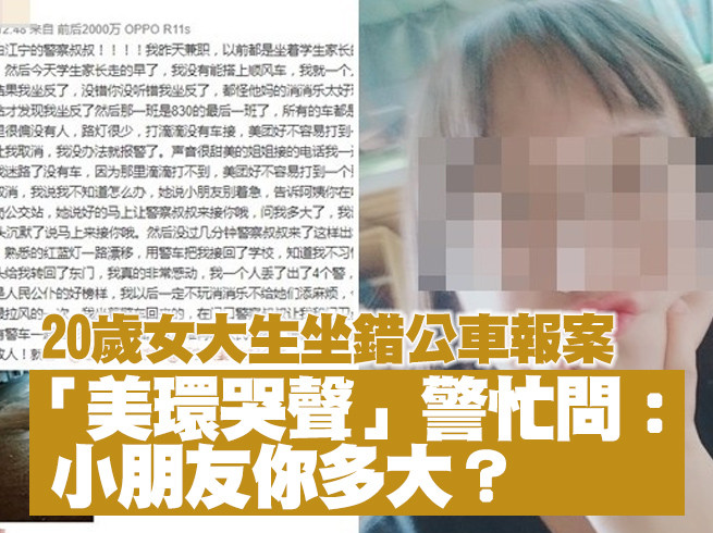 南京一名20歲的女大生10日於微博上發文「表揚」江寧區的警察,文中說,自己前一天晚上做末班公車要返校卻坐錯方向,打電話報警求助後,才順利被載回學校。不過,引發網友噴笑是她在電話的錄音,像卡通小丸子角色美環的哭聲,甚至讓女警誤會的問,「小朋友你多大了?」