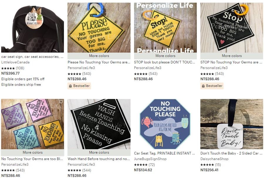 歐美父母為了保護兒童遠離病菌感染,近期掀起一股購買標語熱潮。網路商店亞馬遜(Amazon)及Etsy開始販賣警告標語,像是「看就好,請勿觸摸(Look but please don't touch)」、「請不要靠我太近」或是「你的細菌會害到我(Your germs are too big for me)」等標語,售價約台幣200到300元左右,能夠貼在車座或嬰兒車上,以防小孩遭陌生人「過度熱情」而感染病毒。
