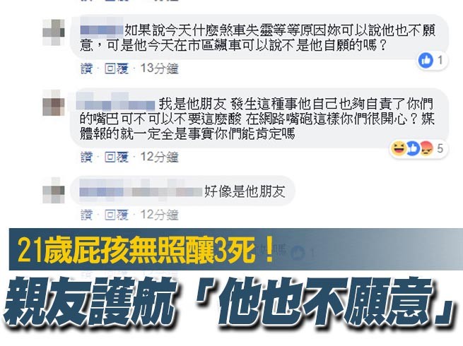此番言論更引起網友憤怒,「那你又是誰?少在那邊裝清高」、「護航了護航了」、「那三位往生者也不願意好嗎」、「有大腦的會在馬路上飆車耍帥??」、「講的好像人家很願意被他撞死」、「他都不尊重人命了,那我要給他什麼尊重?」、「X的無腦,難怪是朋友」。