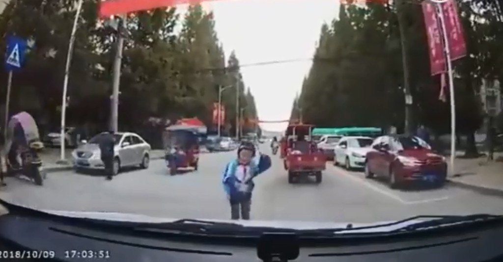 從行車紀錄器可以看到,這名小妹妹本來想快速穿越馬路,卻無奈車子太多,被對向來車擋住去路,只能很尷尬地站在馬路中間等車通過,情況可說是有些危險。該名車主看到後剎車禮讓,於是看到了「很暖的一刻」。