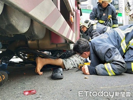 而詹姓貨車駕駛(30歲)表示,當時行經台林街,準備右轉彎義教街時,突然覺得車頭有晃動,趕緊下車查看,發現劉姓傷者下半身卡在輪下,趕緊打119報案。