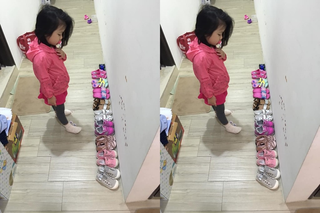 ▲小女孩出門前停在門口,原來是在選鞋子。(圖/翻攝自爆廢公社)