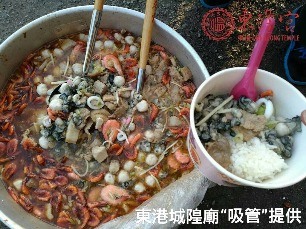 屏東縣東港鎮的東隆宮每3年會舉辦一次「東港迎王平安祭典」,除了盛大的遊行跟燒船之外,最讓人念念不忘的就是餡料滿滿的「飯湯」,裡面有至少7種食材熬出的鮮味且免費提供,讓許多遊客慕名而來。
