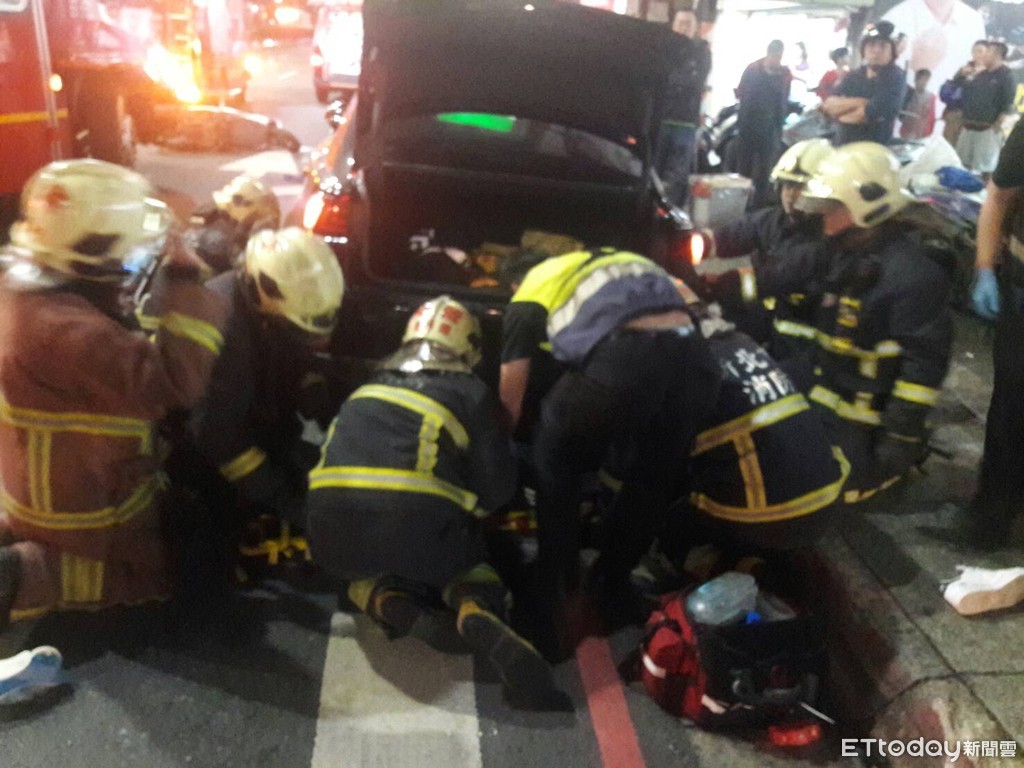 ▲新莊丹鳳捷運站旁發生重大車禍,一輛小客車疑似失控追撞機車,造成機車騎士卡在車底。(圖/記者林裕豐翻攝)