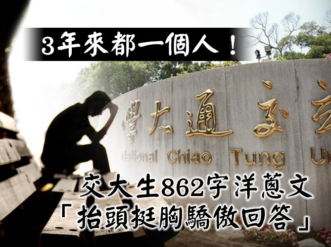 「轉眼間,在交大的時光也邁入最後一年了,這三年多來的日子,我一直、一直都是『一個人』」,這名交大生寫道,「一個人去上課,一個人坐著聽課,下課後就一個人走回宿舍,重修微積分時,一個人看著莊重的OCW,再一個人去考會。」