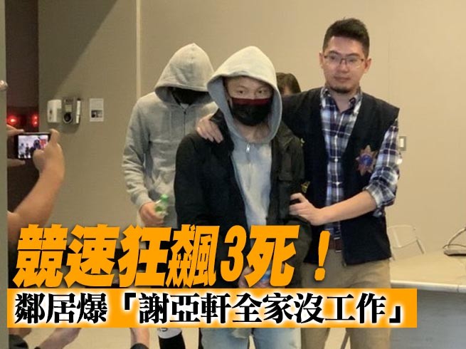 台北市南京東路11日發生重大車禍,21歲男子謝亞軒與友人競速飆車,失控撞上一旁正在做資源回收的夫婦及保全,釀3人死亡。法官最後裁定謝男以15萬元交保、限制住居,不過最後等嘸人來辦保,北院裁定羈押。鄰居透露,謝男全家都沒工作,可能是爸爸不願意付交保金。