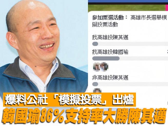 年底9合1大選倒數1個多月,國民黨在高雄市能否翻盤備受外界關注。臉書社團「爆料公社」14日晚間在網路上舉行模擬投票,吸引11萬多名社員投票;活動結果約22時公布,韓國瑜以86%得票率大勝陳其邁的14%。