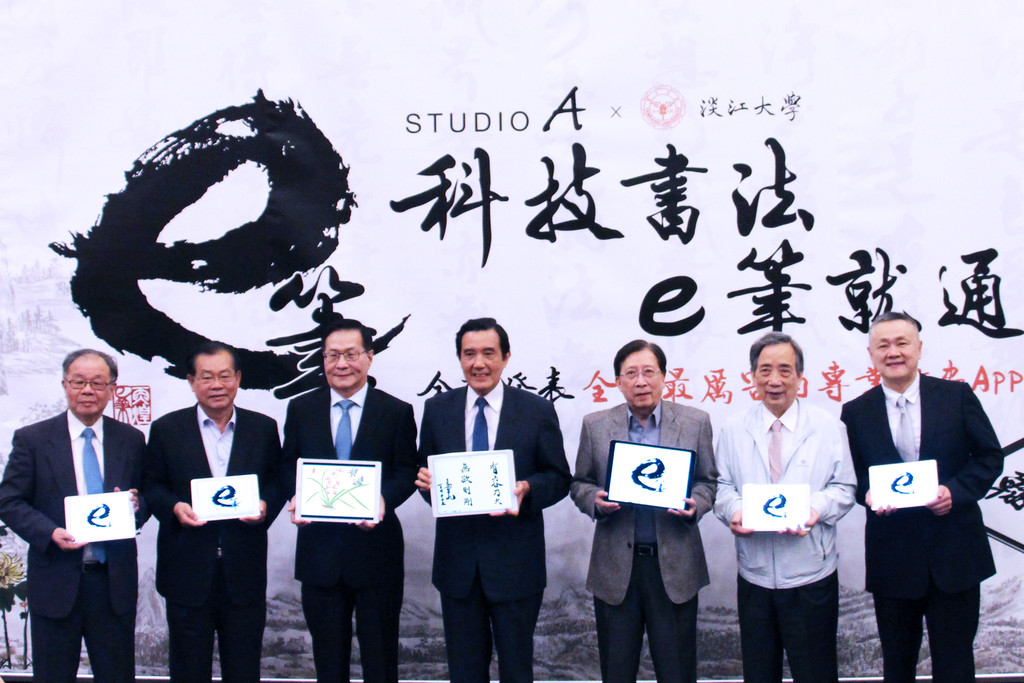 ▲透過「e筆書畫App」不需筆墨紙硯就能寫書法,前總統馬英九(中)也秀出精湛的書法功力。(圖/晶實科技提供)