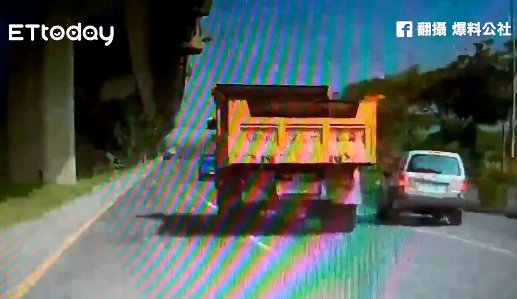 畫面中,只見砂石車隨著路面搖搖晃晃,下一秒突然往中線切入,旁邊一台銀色休旅車本來想加速前進,似乎想避免跟大車並排,不過最後卻遭砂石車當場擠走,險象環生。