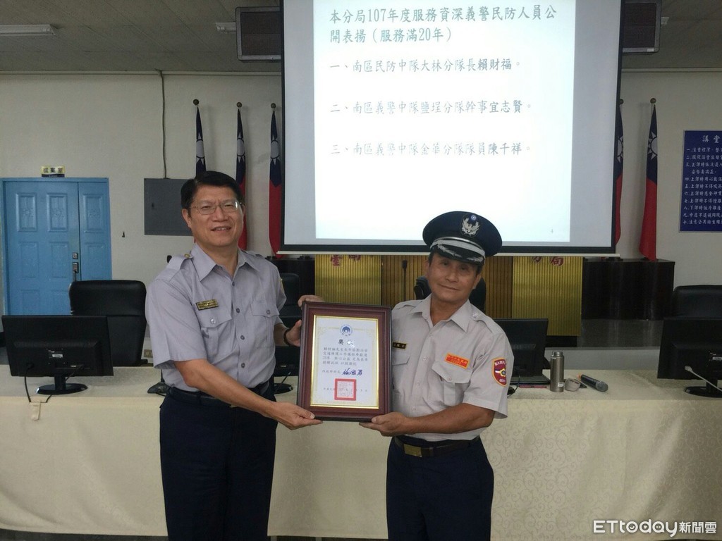 ▲台南市警六分局長許坤田,轉頒內政部長徐國勇表揚107年資深民防義警獎狀。(圖/警方提供,下同)