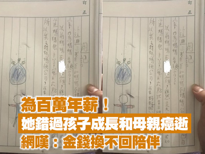她兒子上小學之後,常常跟她說,「希望媽媽能像其他同學家長一樣,早上送到學校。晚上早早到家每天煮晚餐。」她也終於決定要辭去工作多陪孩子。日前,她在兒子的週記上看到他說,「以前媽媽在OO上班,雖然是大公司,但我知道媽媽很辛苦」,還說自己支持媽媽換公司,才能照顧身體不會太累。