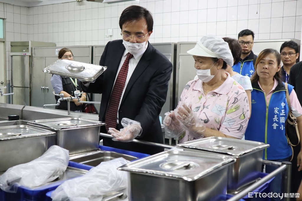 ▲花蓮縣代理縣長蔡碧仲視察營養午餐配膳情形,並與學童共進午餐。(圖/記者王兆麟攝,下同)