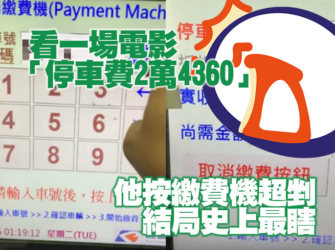 今天,苦主將車停放在駁二附近的停車場後,就安心去看電影了,那時場內只有他一輛,沒想到看完兩個多鐘頭,回到停車場操作繳費機時,費用卻跑出2萬4360元。