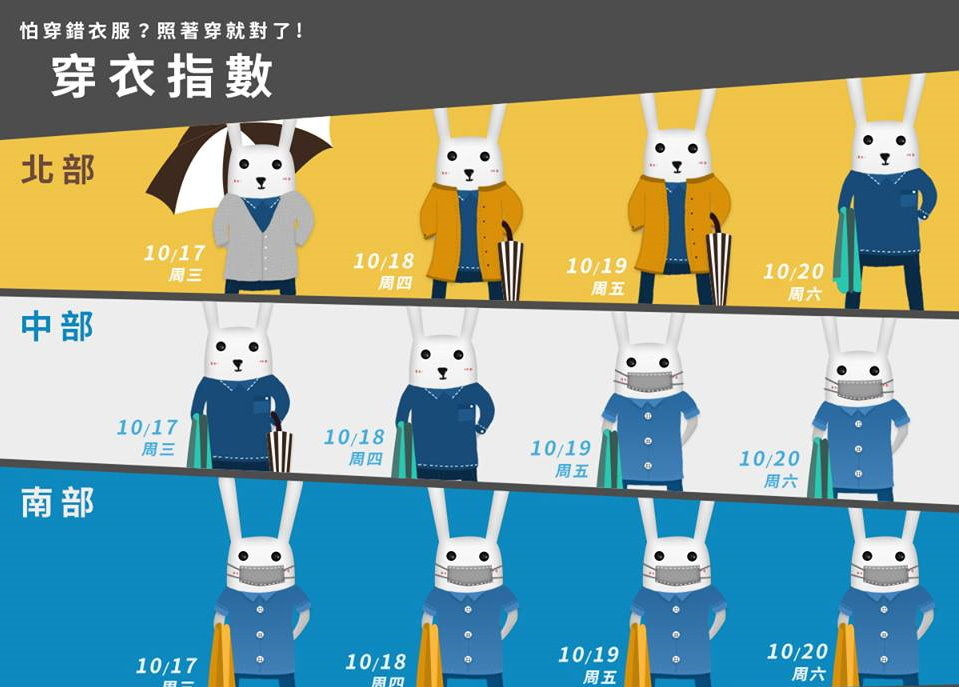 天氣風險公司則製作「未來4天穿衣小撇步」圖表說,北部、東部今水氣仍多,周四、周五北部低溫下探20度,同時雨勢緩和;東部持續有雨,周六起回溫轉晴;中、南部天氣變化不大,今偶有零星陣雨,周四起溫暖穩定,留意日夜溫差較大以及空品較差。