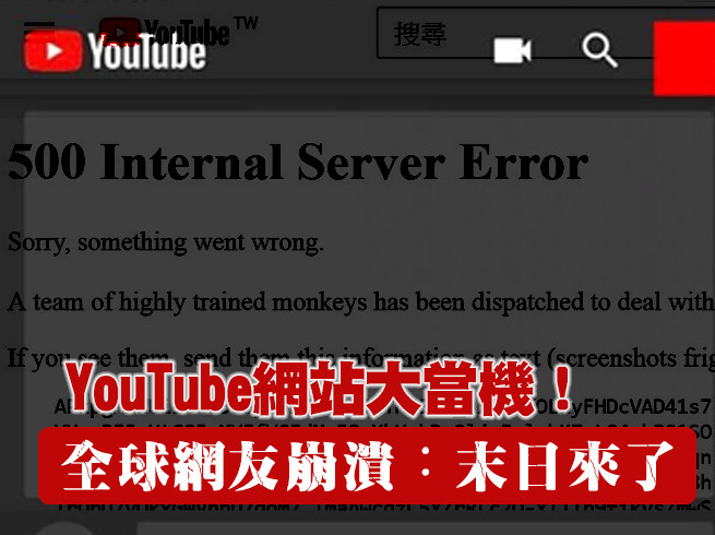 YouTube網站大當機!全球網友在推特上紛紛討論YouTube好像死掉了,完全開不起來,不斷出現錯誤的畫面。《ETtoday新聞雲》記者實測,YouTube網站出現大空白,完全開不起任何的畫面,嵌入的影片也跑不出來,呈現一片亂碼,還以為是輸入錯誤,貌似整個故障。