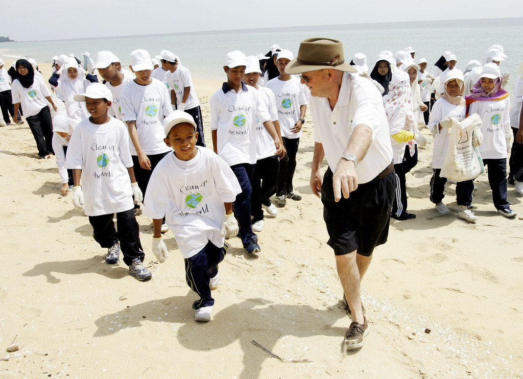 ▲基爾南2005年在馬來西亞教導學童整理垃圾,他說,「清理不是問題的答案,但這是很棒的開始。」(圖/達志影像/美聯社)