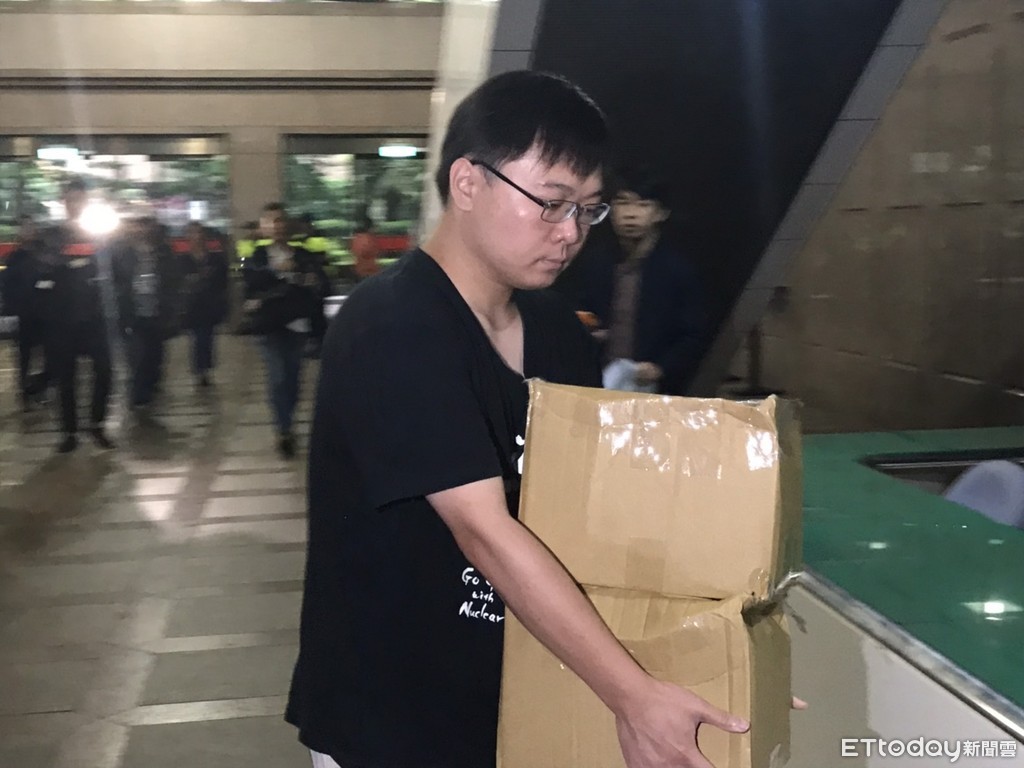 ▲黃士修和以核養綠的成員一箱箱的將車上的連署書辦到中選會大廳。(圖/記者許展溢攝)