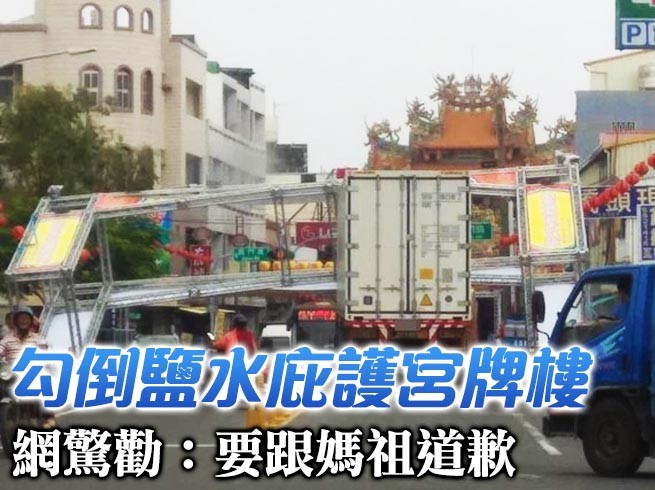 台南鹽水護庇宮預計在本月31日起舉辦南巡遶境,廟前道路也立起一座大型牌樓,沒想到17日上午10點多一輛貨櫃車經過不慎勾倒牌樓,「砰」的一聲巨響嚇壞附近居民,幸好並沒有人因此受傷。