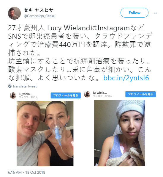27歲的澳洲女子露西(Lucy Wieland)先前在Instagram上,分享自己對抗卵巢癌的心路歷程,同時設立一個「GoFoundMe」的帳戶,向網友尋求財務上的幫助,獲得55000澳元(約120萬台幣)。不過露西卻在近日遭人踢爆,她在社群網路上的照片通通是假的,戴呼吸器、剃頭髮等行為,都只是為了博取大眾的同情,以詐騙金錢。