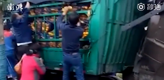 陝西漢中17日發生一起貨車遭追撞案件,當民警將貨車拖至洋縣黨濱暫放時,卻出現約50人來瘋搶車斗上的橘子,他們爬上車架,直接把一箱箱橘子拿回家,還有許多孩子跟著父母一起「搬貨」,就算貨車駕駛阻止也沒用,最後估計損失約1噸左右。