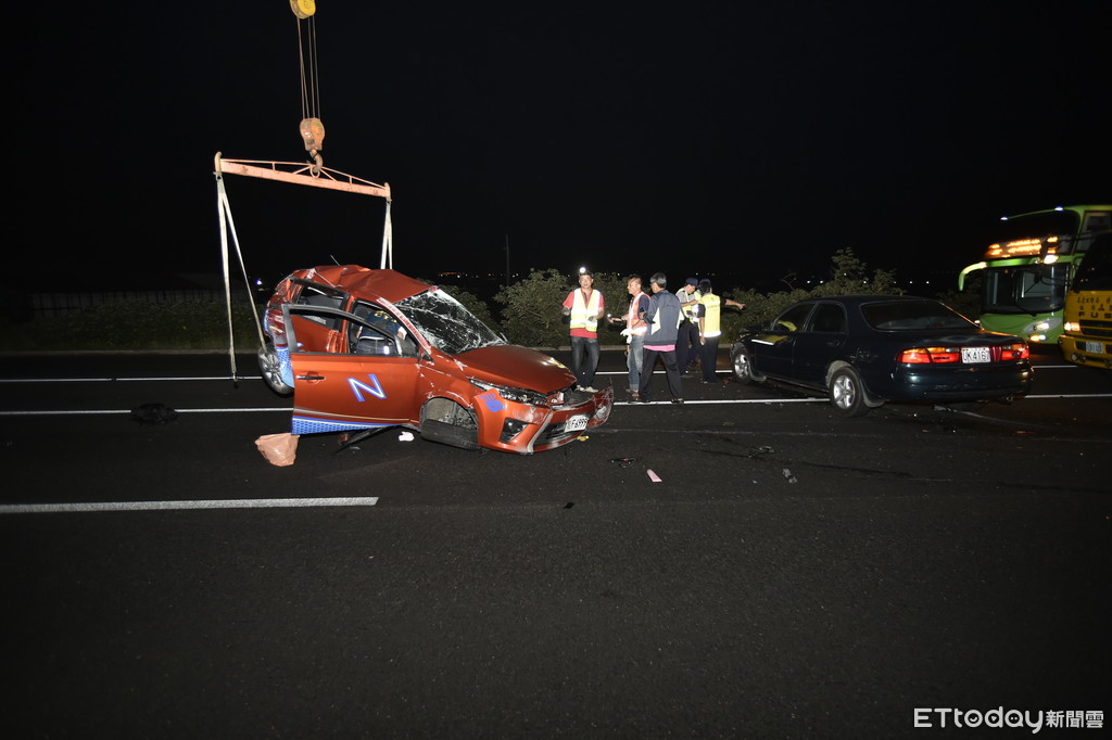 據了解,這次車禍的3輛小客車中,白色轎車薛姓男駕駛(33歲)原本要到高雄出差,因行駛內側車道未保持安全距離,高速衝撞曾姓男子(34歲)所駕駛的紅色轎車,車上還載有妻女,因撞擊力道過大,兩車均翻覆,其中曾男受傷送醫,坐在紅車後座的妻女,邱姓女子(30歲)被拋出車外頭顱破裂當場死亡,曾姓女童(5歲)遭車體重壓也不幸身亡,車禍發生瞬間,另輛綠色轎車也因使慘遭波及,但駕駛無受傷。