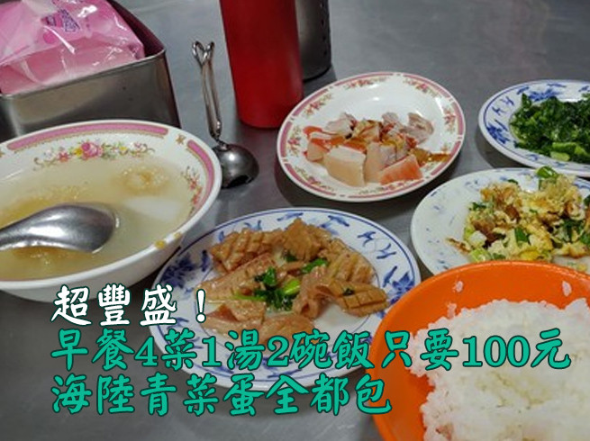 網友在社團中貼出一張照片說,「抱怨自己食量大又吃不胖,然後這是我的早餐100元」,圖中一張鐵桌被擺得滿滿的,有蒜泥白肉、蔥花蛋、炒魷魚、炒青菜和一大碗蘿蔔湯,還有兩大碗裝得滿滿的白飯,這是女網友自己一個人吃的份量,全部加起來只要100元。