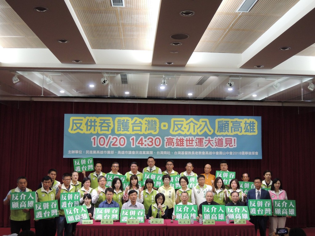 而民進黨高雄市黨部主辦的「反併吞 護台灣反介入 顧高雄」活動下午2時30分在高雄世運大道舉行,呼籲民眾展現台灣不容中國併吞的團結意志與決心。
