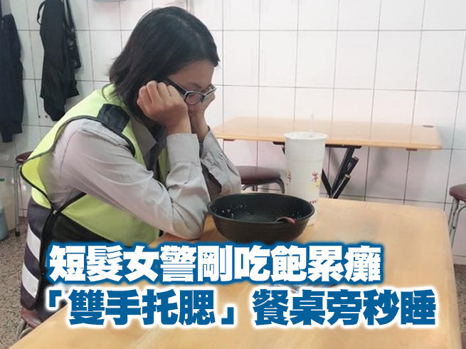 網友在臉書「爆怨公社」社團中貼文,「吃個飯,看到累成這樣的波麗士姊姊,真的是辛苦你了,好心疼」,戴著眼鏡的短髮女警坐在木餐桌前,面前的碗早已空了,她卻遲遲未離開,2隻手撐在桌上托著頭,就這樣在餐廳裡睡著了,想必是剛結束繁忙的工作累壞了。