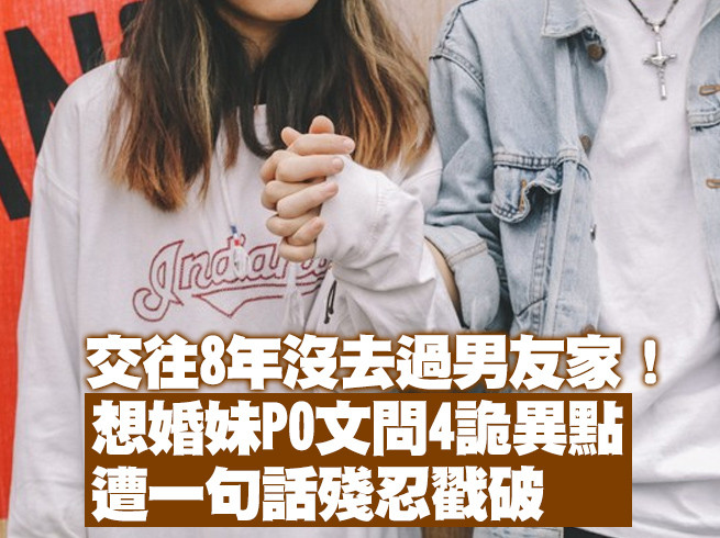 有一名女網友在網上發文求助,表示她和男友交往將近8年,已論及婚嫁,但對方始終不願帶她回家,也沒讓她見過家人。她雖一度想看男友身分證和戶籍謄本,但對方總推說是由母親保管,而且回家後一向不接電話,讓她不禁想問「請問這樣正常嗎…?」引發網友熱議。