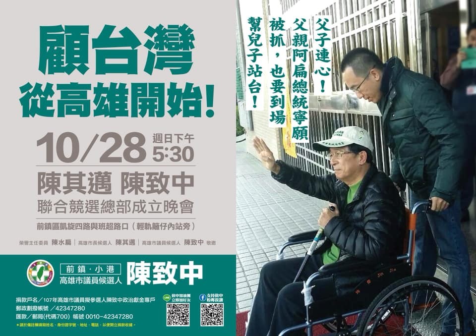 陳致中自投入選戰以來,陳水扁就不斷的在背後默默支持,這次他參選高雄市前鎮、小港區高雄市議員選舉,預計28日成立競選總部,陳水扁更不畏台中監獄規定,執意要幫兒子站台。