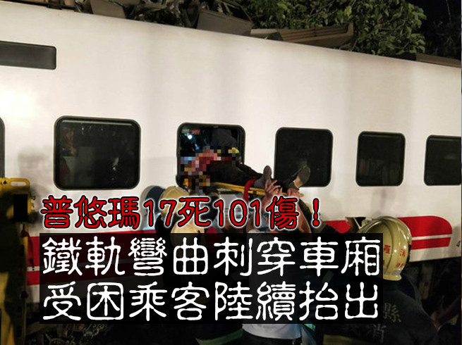 宜蘭蘇澳新馬站21日下午發生普悠瑪列車出軌的嚴重意外,根據台鐵消息,已知列車上有乘客約310人,目前初估有17死亡,另有101人受傷者。因車廂扭曲變形的原因導至仍有旅客受困,其中第六節車廂受損最嚴重,目前消防員正將受困民眾陸續抬出,目前傷患送至 蘇榮、聖母、博愛、陽大、仁愛等 醫院救治。